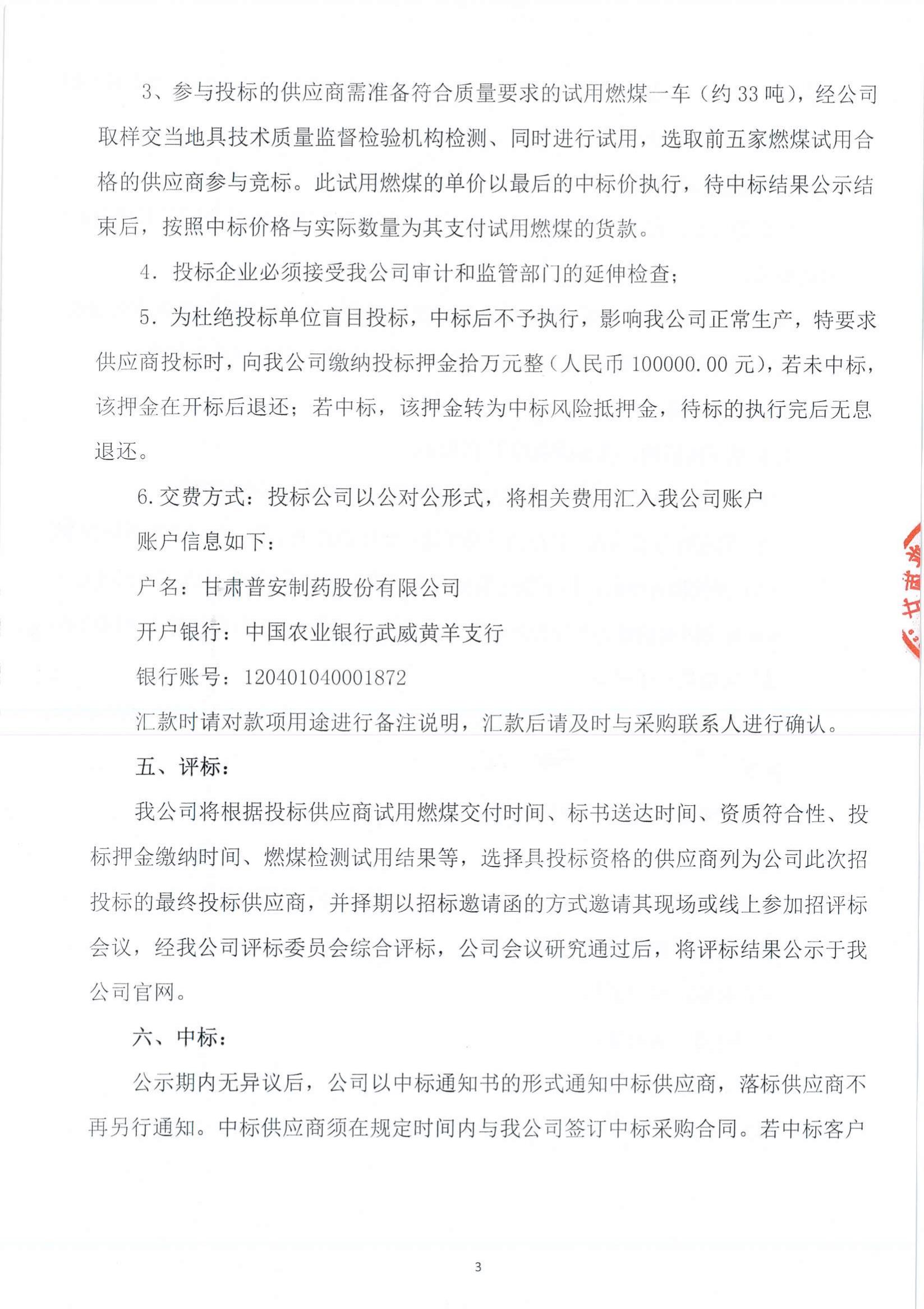 甘肅普安制藥股份有限公司燃煤公開招標(biāo)采購(gòu)公告