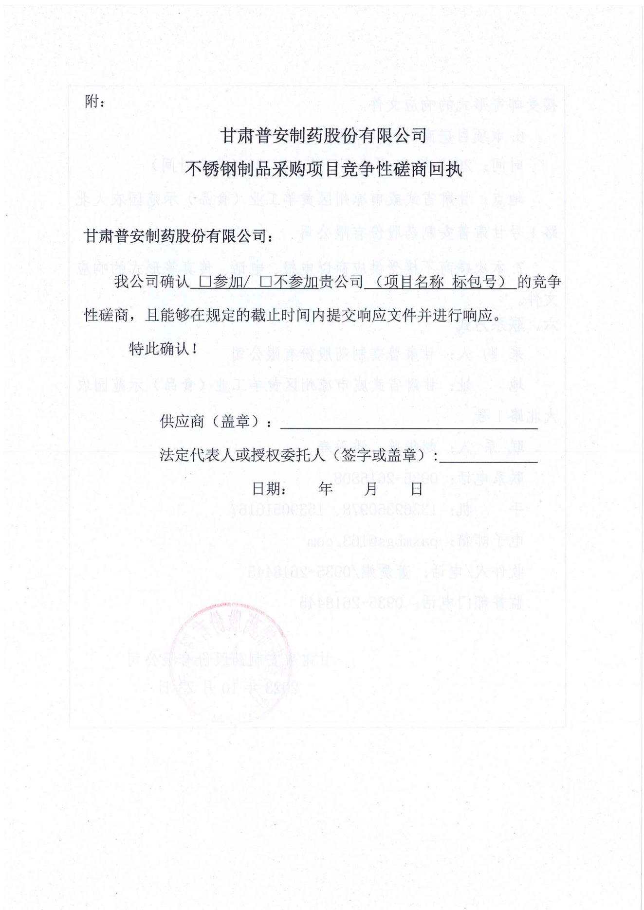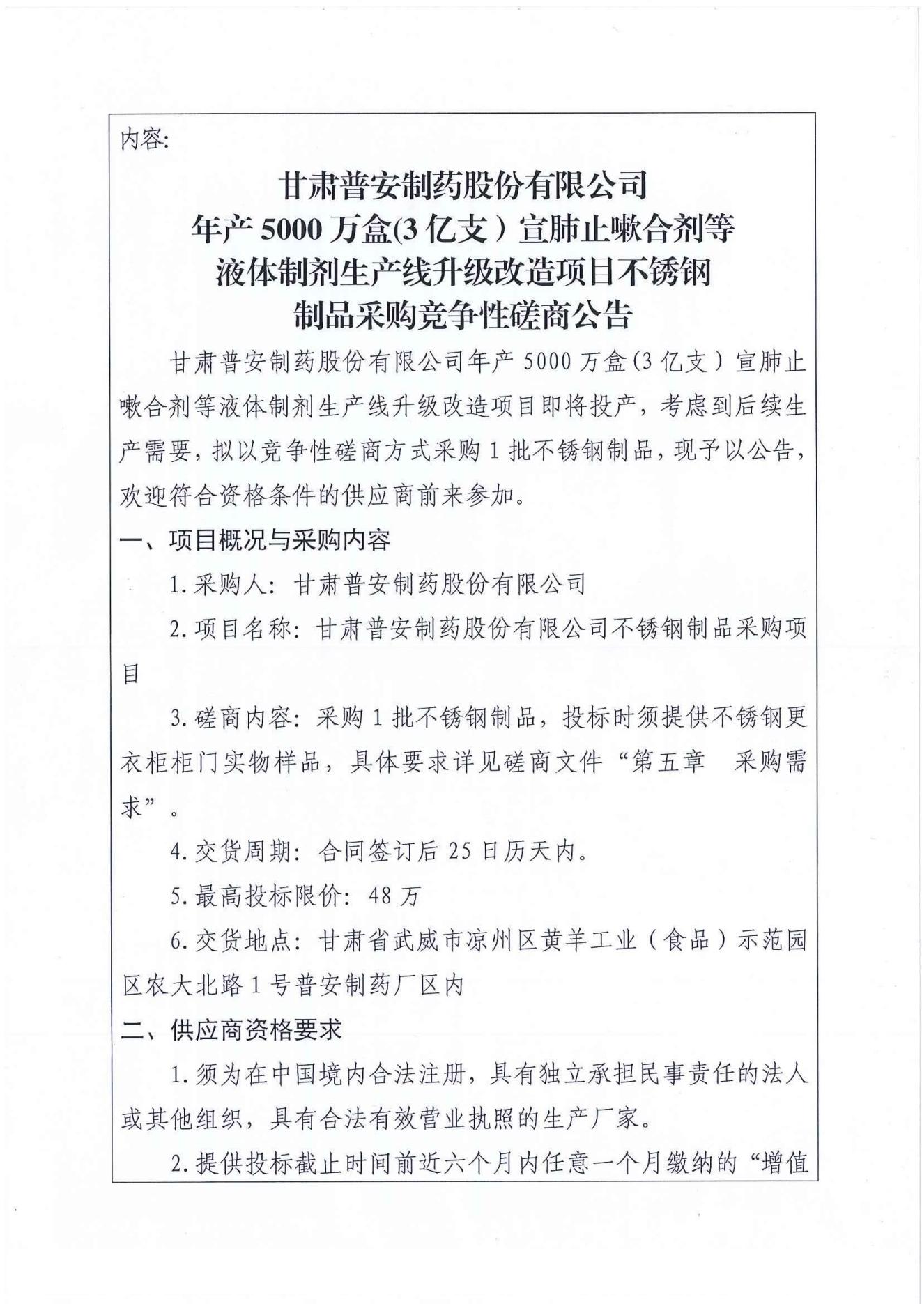 甘肅普安制藥股份有限公司年產5000 萬盒(3億支)宣肺止嗽合劑等液體制劑生產線升級改造項目不銹鋼制品采購競爭性磋商公告