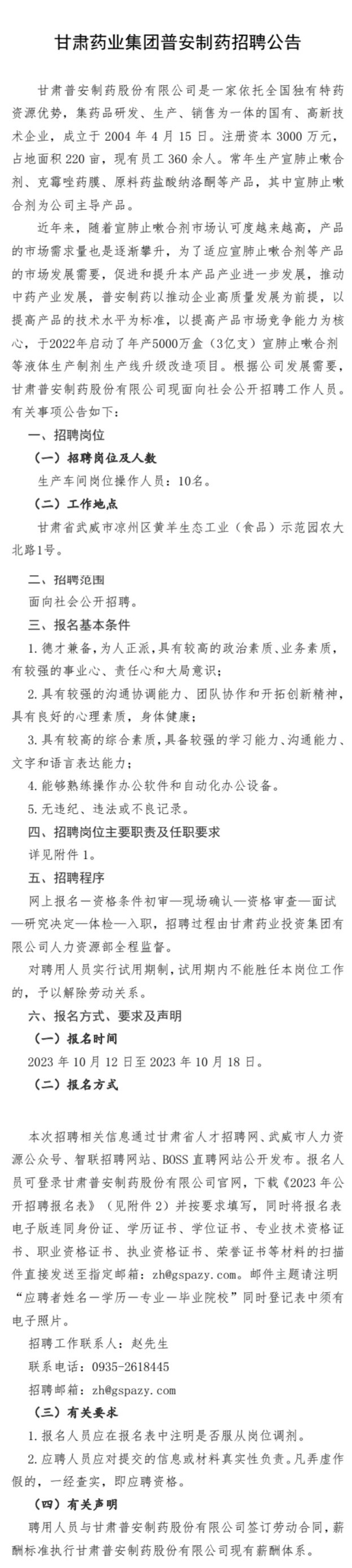甘肅藥業(yè)集團(tuán)普安制藥招聘公告