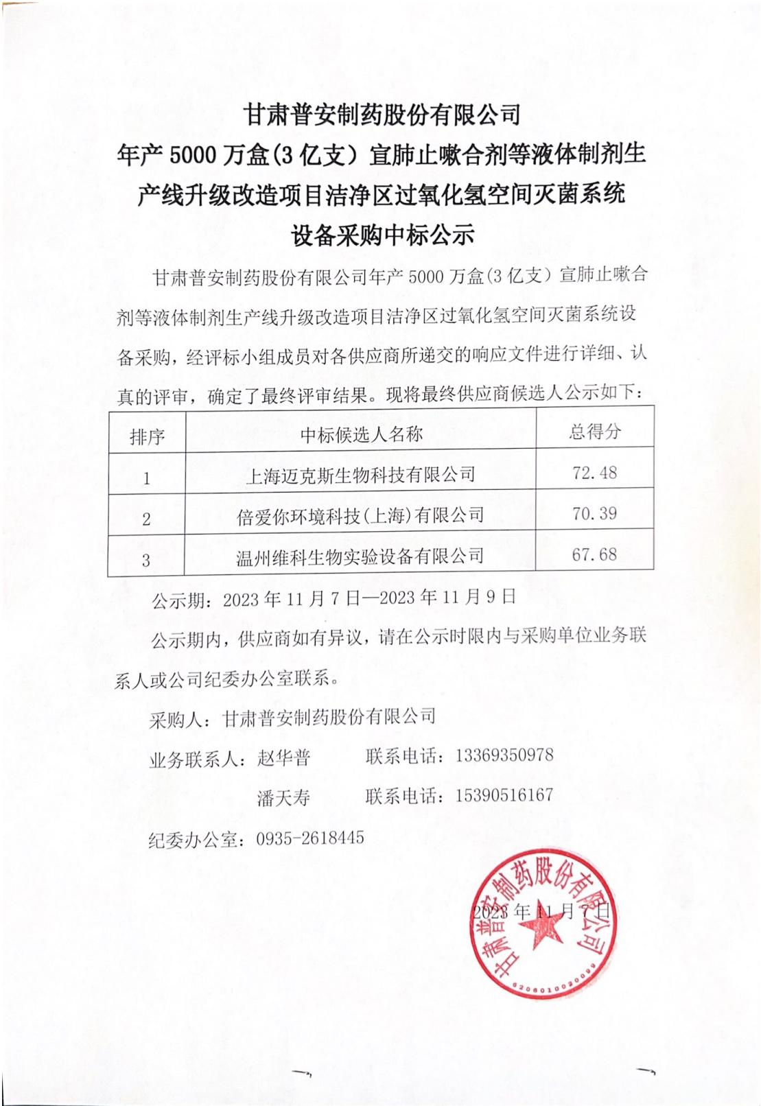 甘肅普安制藥股份有限公司年產(chǎn)5000萬盒(3億支)宣肺止嗽合劑等液體制劑生產(chǎn)線升級改造項目潔凈區(qū)過氧化氫空間滅菌系統(tǒng)設(shè)備采購中標(biāo)公示