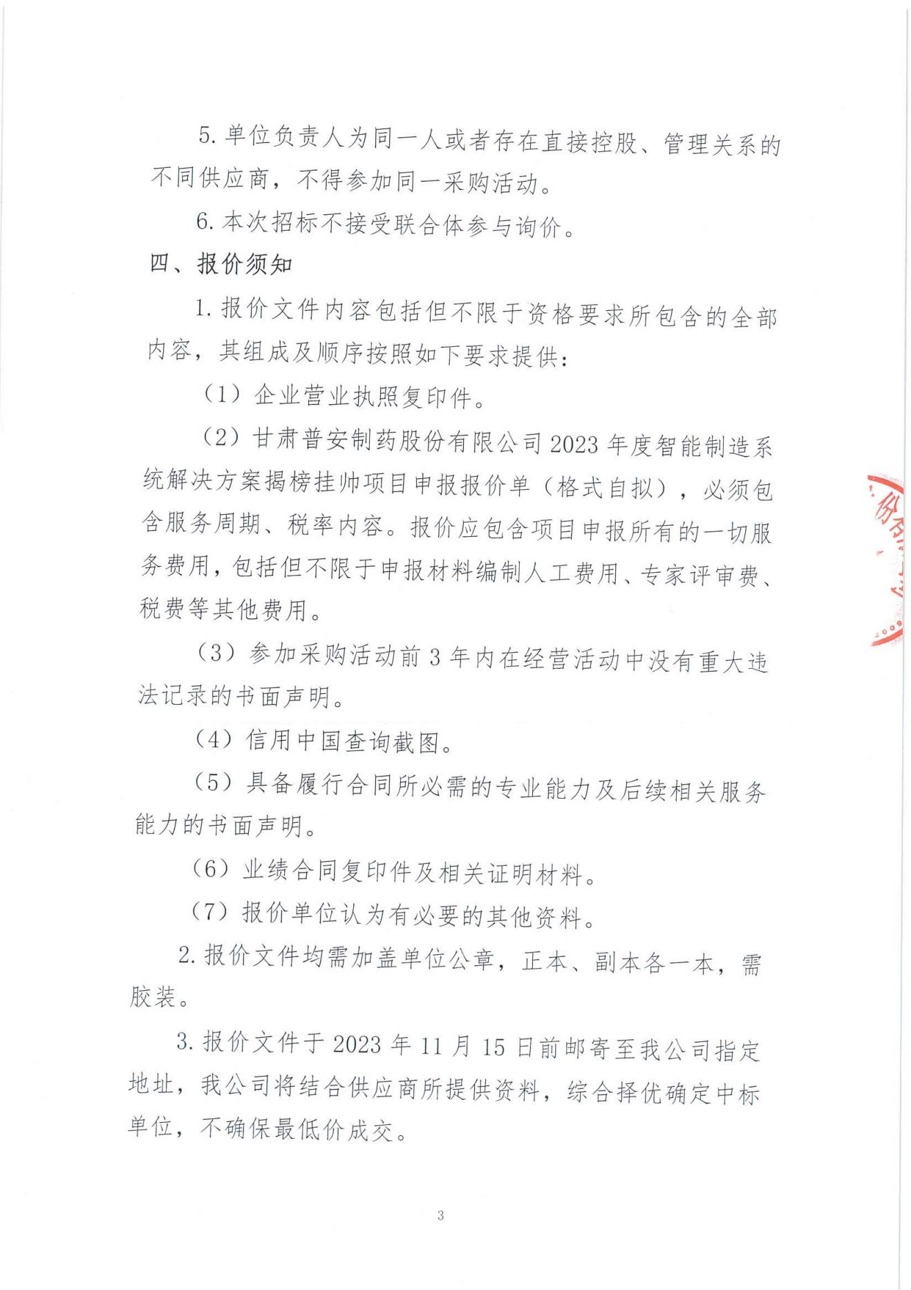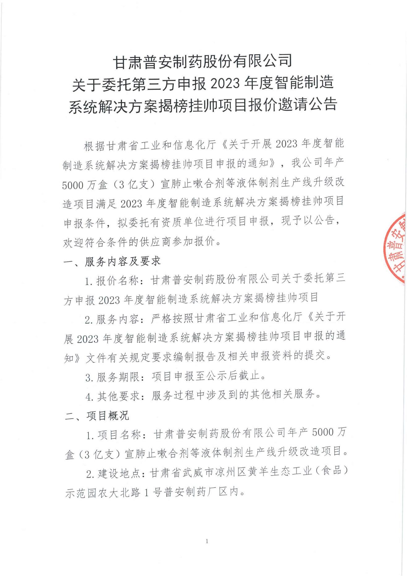 甘肅普安制藥股份有限公司關于委托第三方申報2023年度智能制造系統解決方案揭榜掛帥項目報價邀請公告