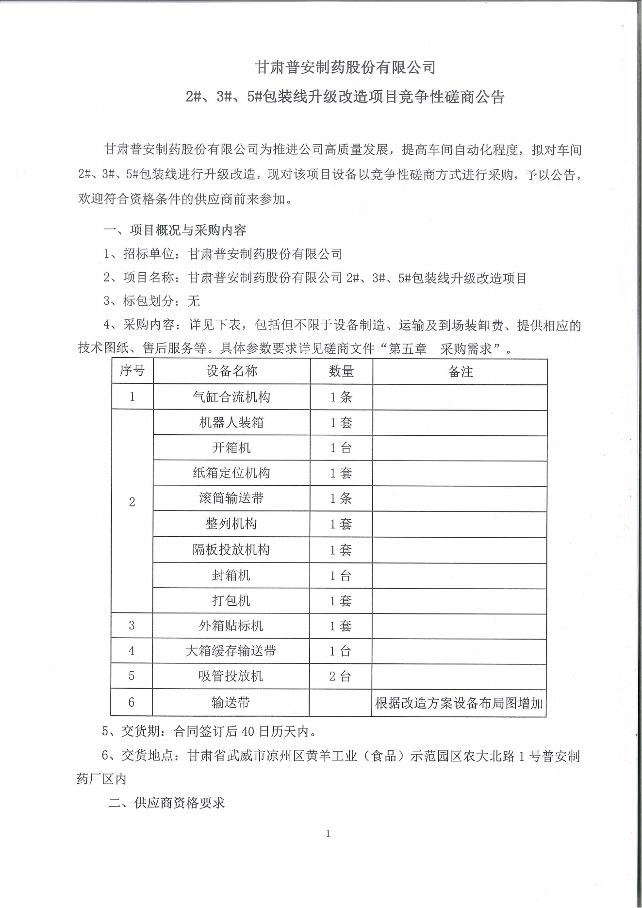 甘肅普安制藥股份有限公司 2#、3#、5#包裝線升級改造項目競爭性磋商公告
