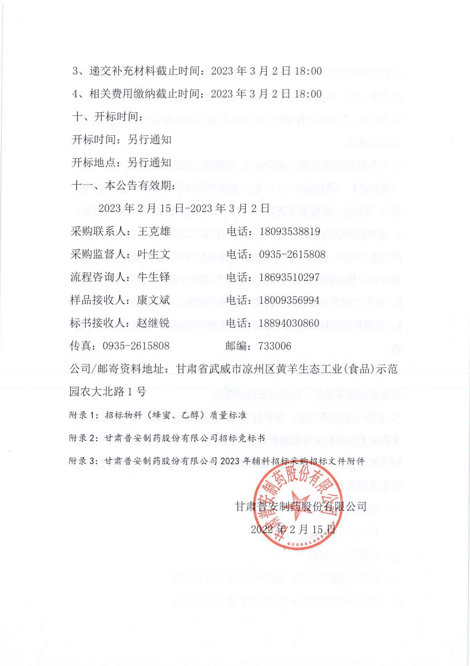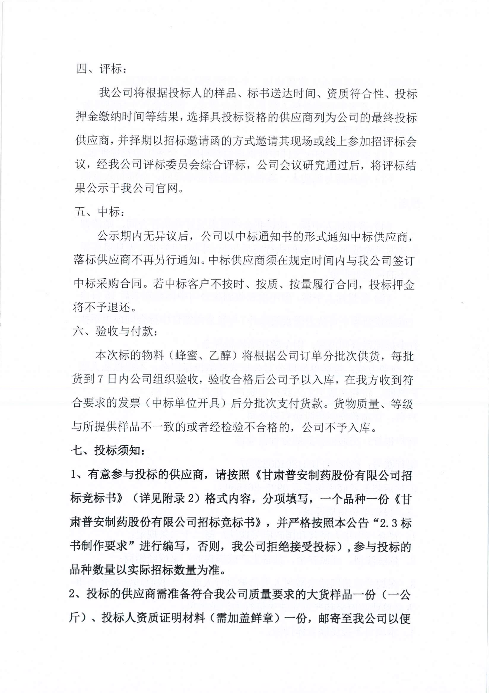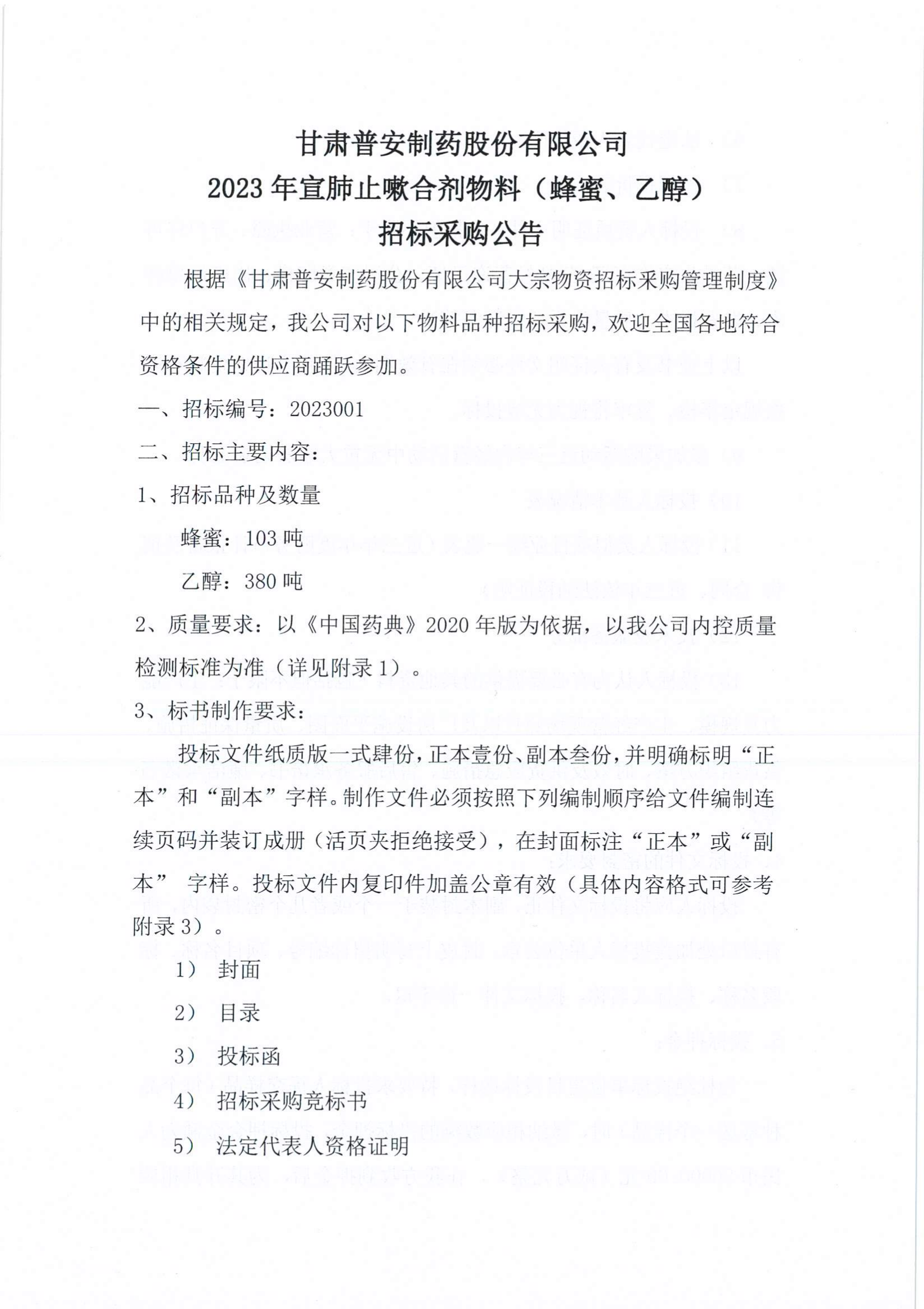 甘肅普安制藥股份有限公司2023年宣肺止嗽合劑物料(蜂蜜、乙醇)招標采購公告