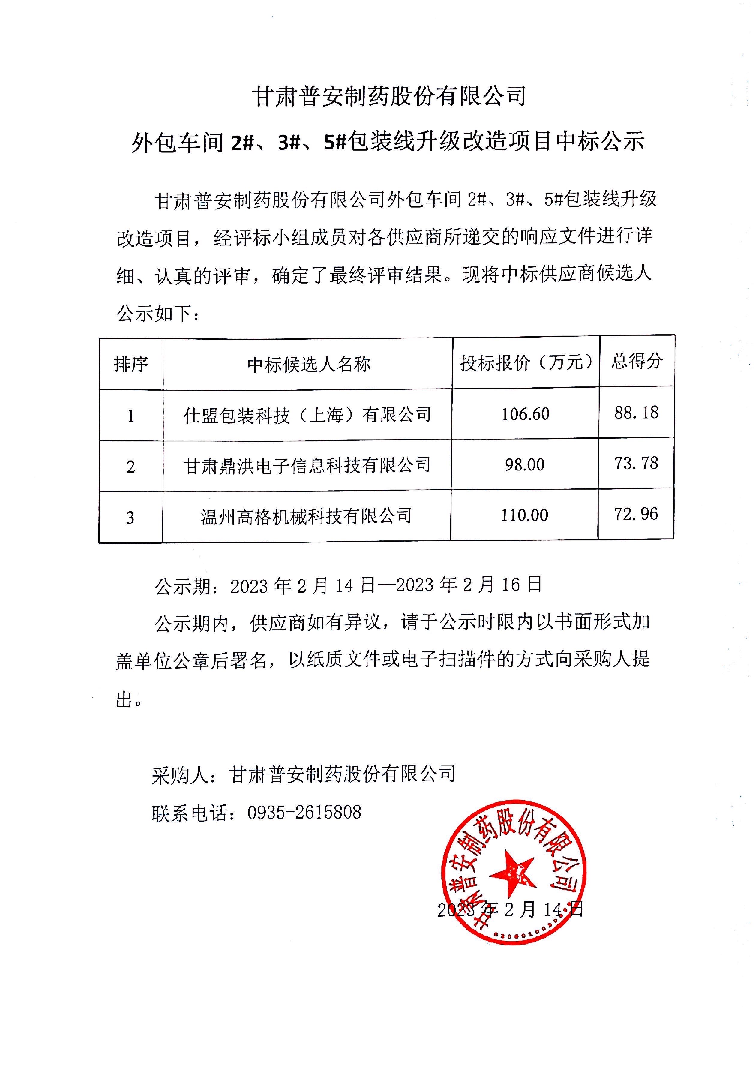 甘肅普安制藥股份有限公司外包車間2#、3#、5#包裝線升級改造項目中標公示