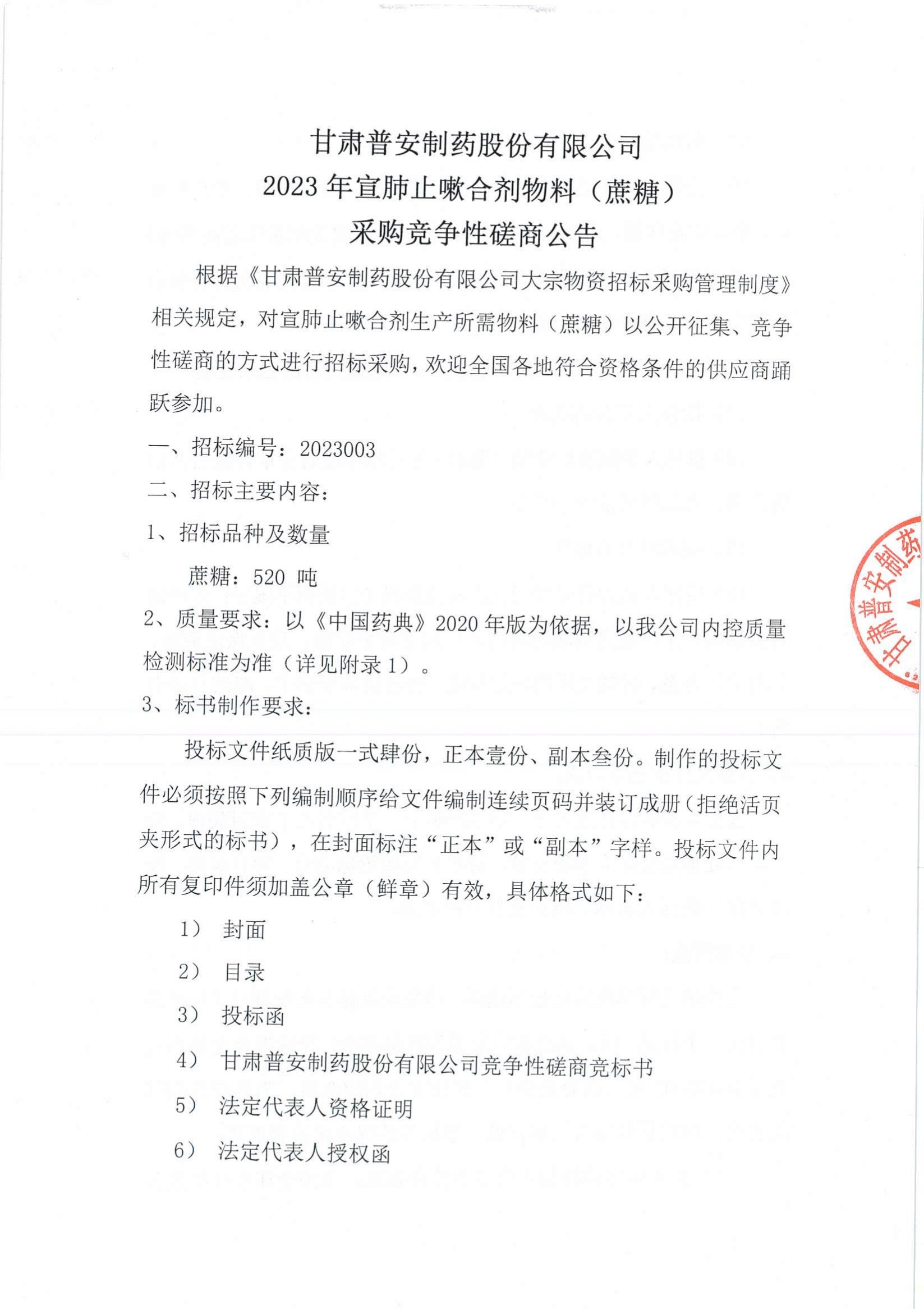 根據《甘肅普安制藥股份有限公司大宗物資招標釆購管理制度》 相關規定,對宣肺止嗽合劑生產所需物料(蔗糖)以公開征集、競爭性磋商的方式進行招標采購,歡迎全國各地符合資格條件的供應商踴躍參加。