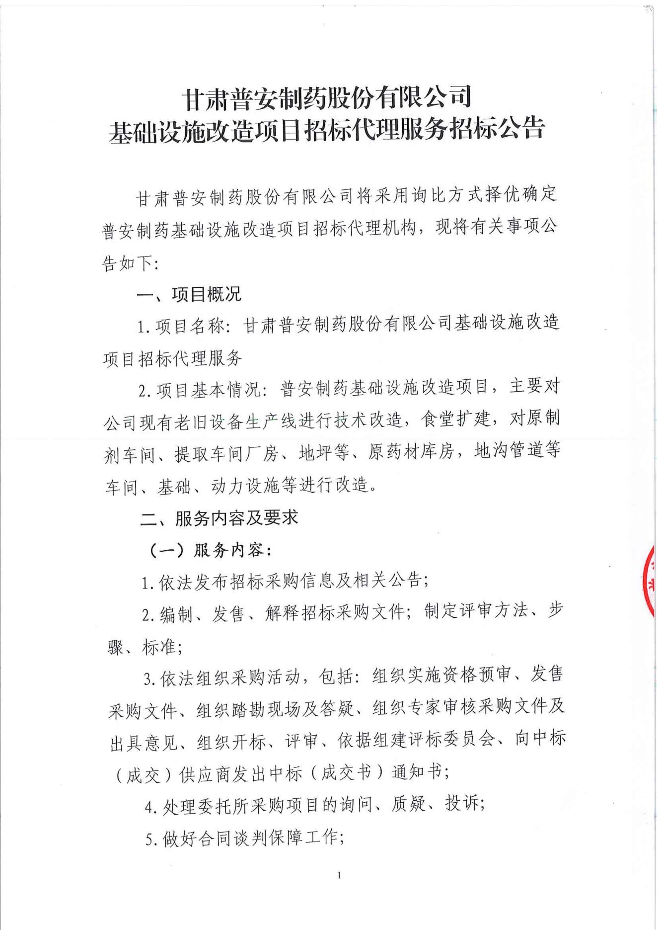 甘肅普安制藥股份有限公司基礎設施改造項目招標代理招標公告