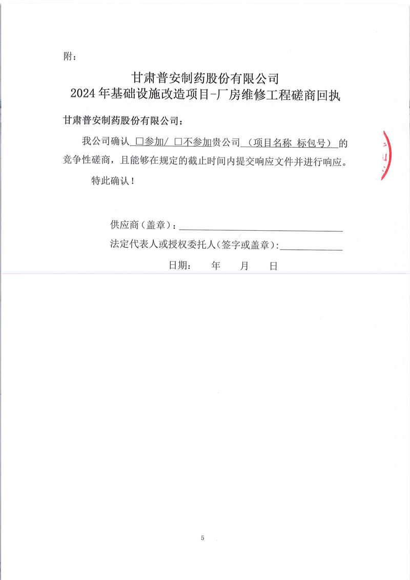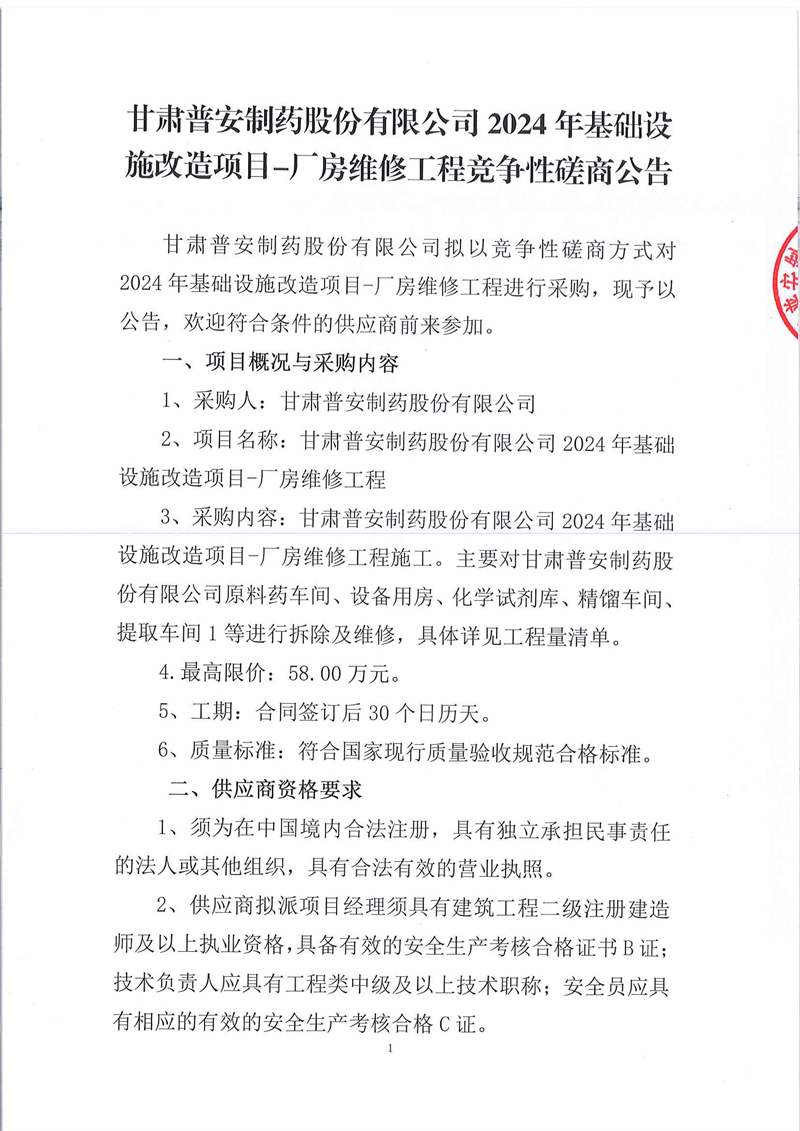 甘肅普安制藥股份有限公司2024年基礎設施改造項目-廠房維修工程競爭性磋商公告