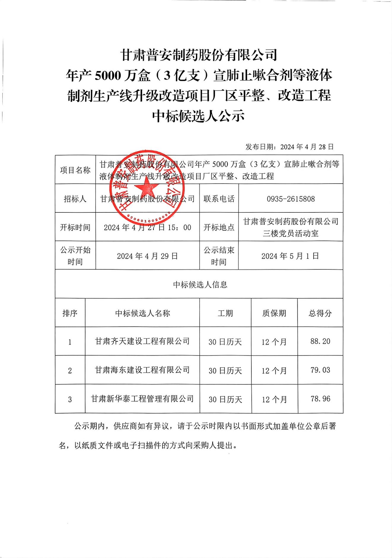 甘肅普安制藥股份有限公司年產(chǎn)5000萬盒(3億支)宣肺止嗽合劑等液體制劑生產(chǎn)線升級改造項(xiàng)目廠區(qū)平整、改造工程中標(biāo)候選人公示