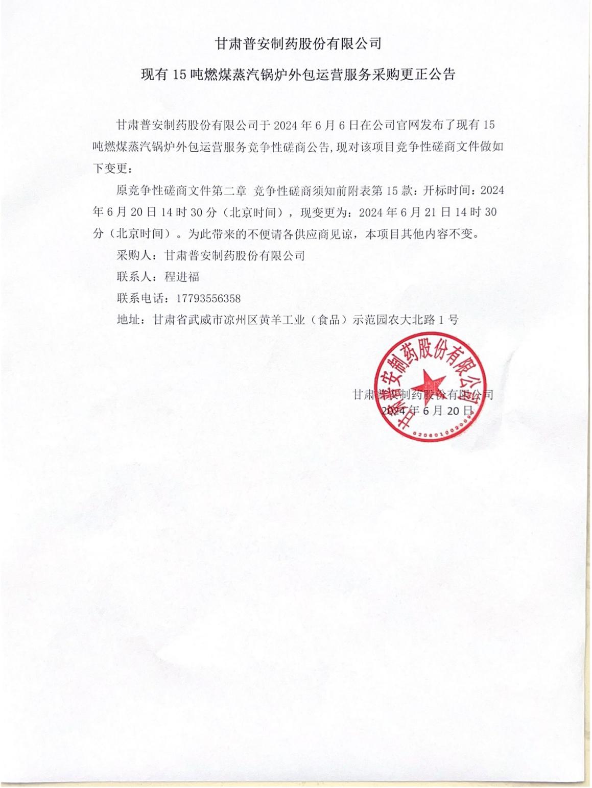 甘肅普安制藥股份有限公司現有15噸燃煤蒸汽鍋爐外包運營服務采購更正公告