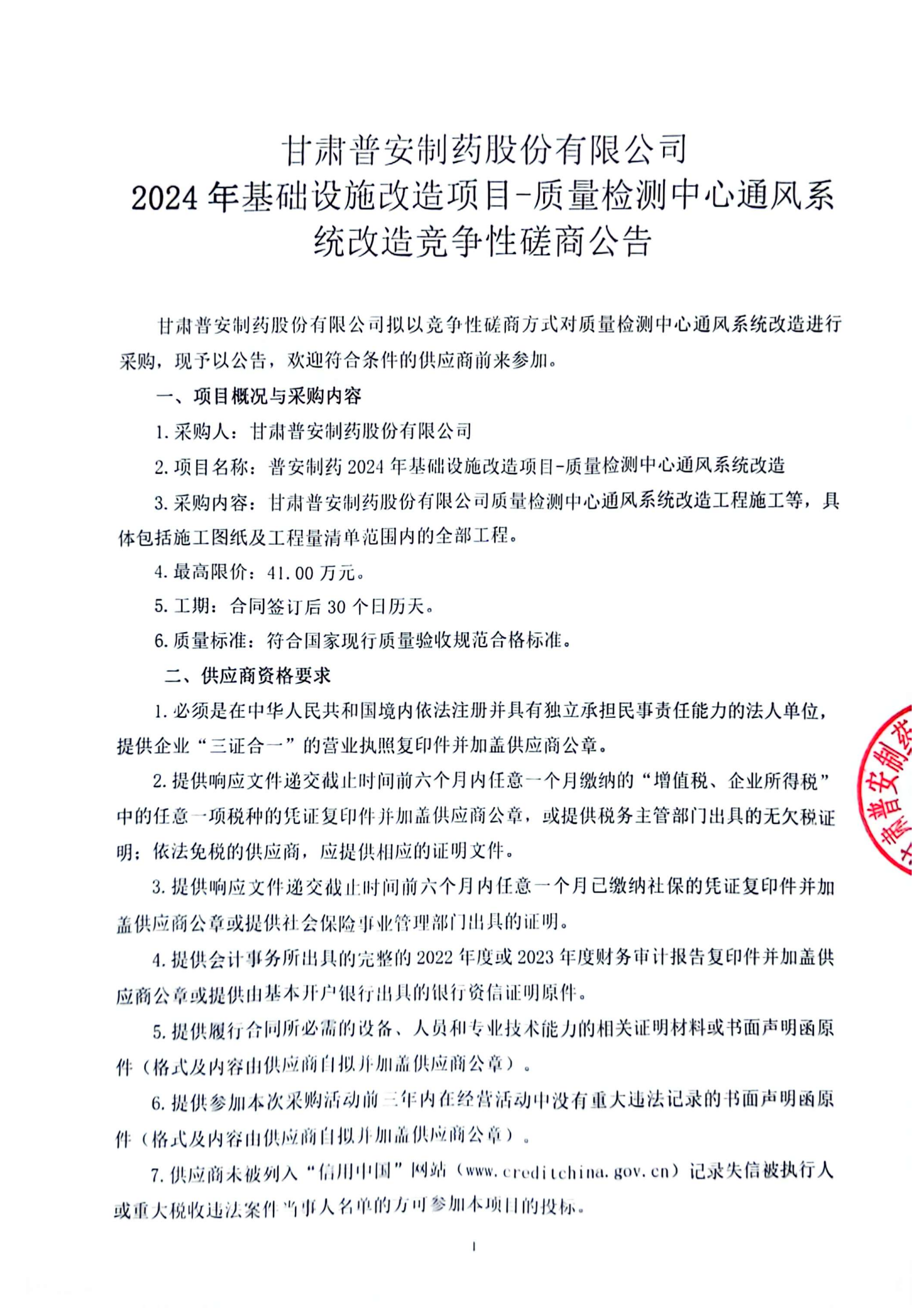 甘肅普安制藥股份有限公司2024年基礎設施改造項目-質量檢測中心通風系統改造競爭性磋商公告