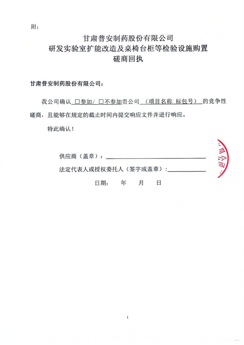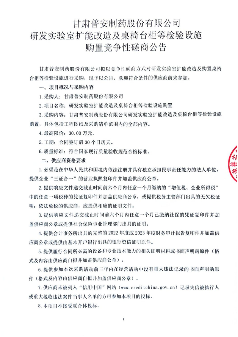 甘肅普安制藥股份有限公司研發(fā)實驗室擴能改造及桌椅臺柜等檢驗設施購置競爭性磋商公告