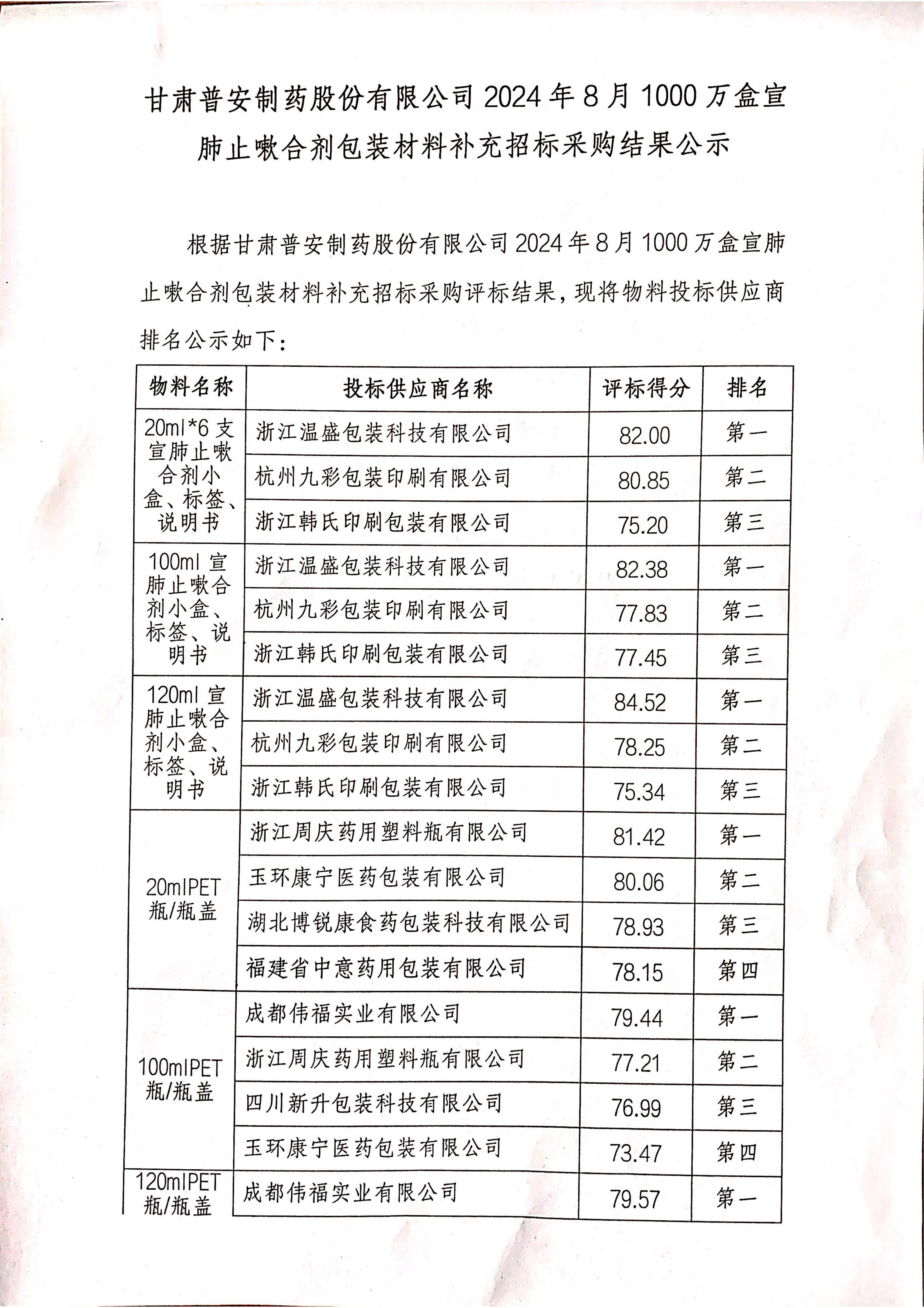 甘肅普安制藥股份有限公司2024年8月1000萬盒宣肺止嗽合劑包裝材料補充招標采購結果公示