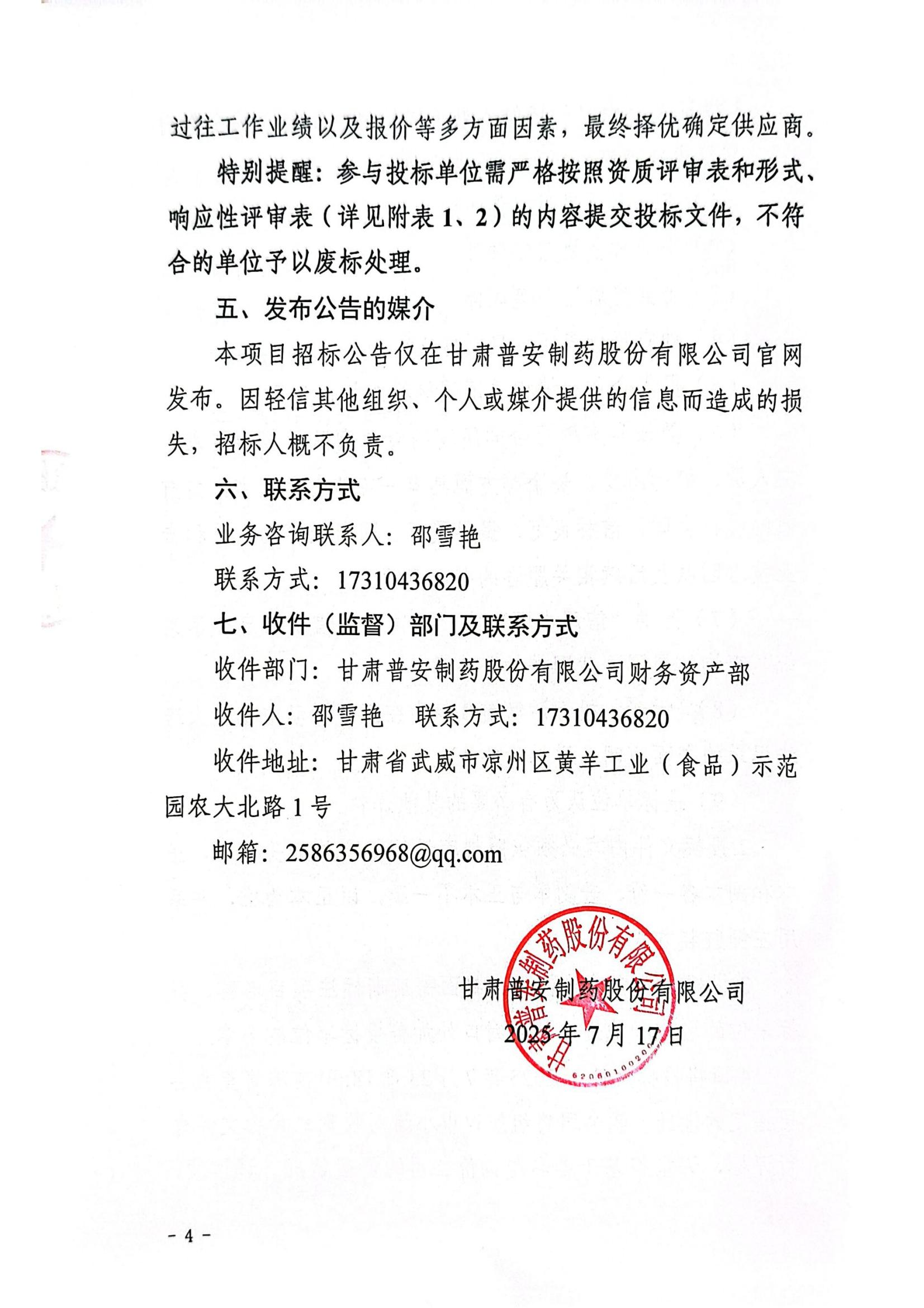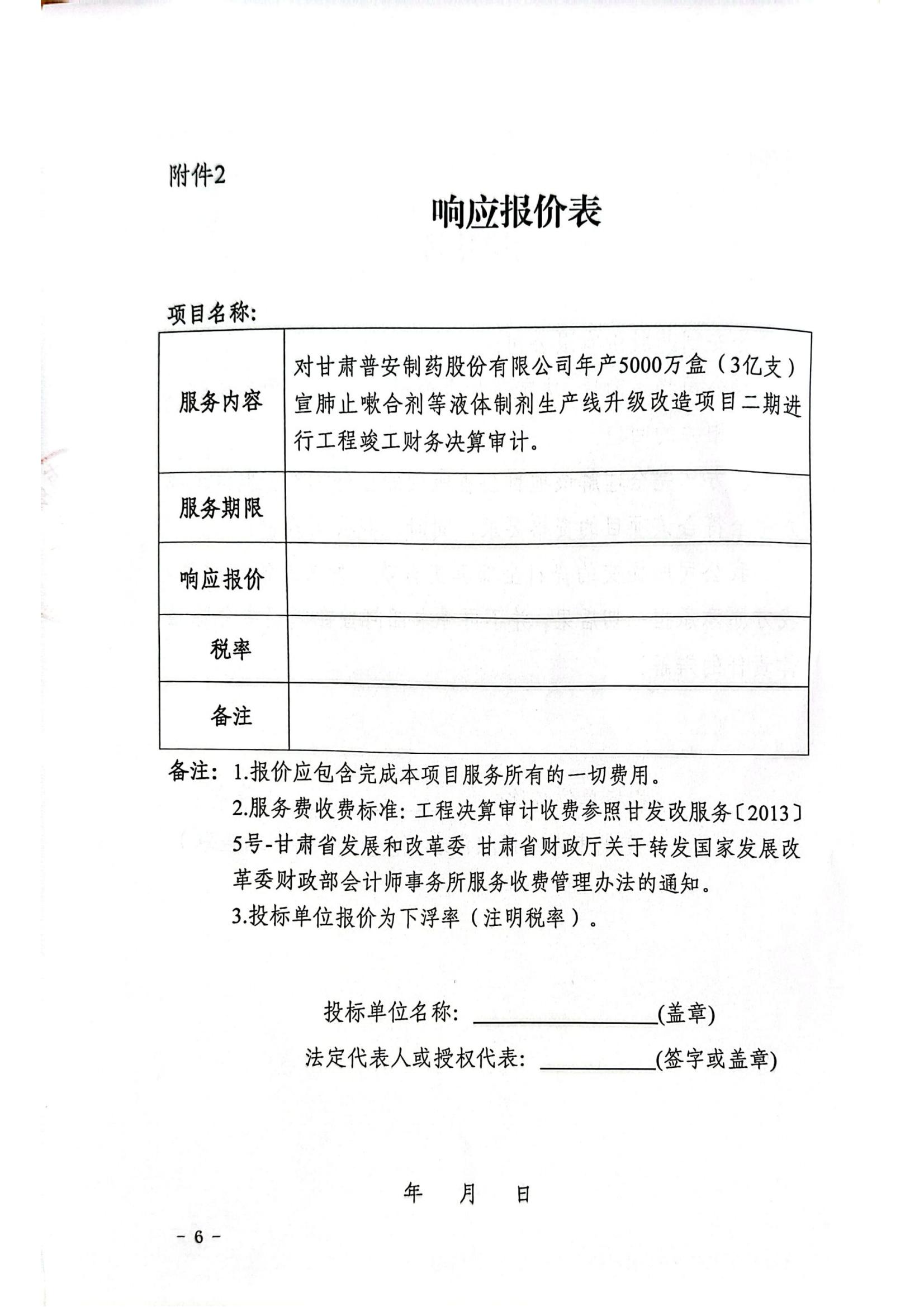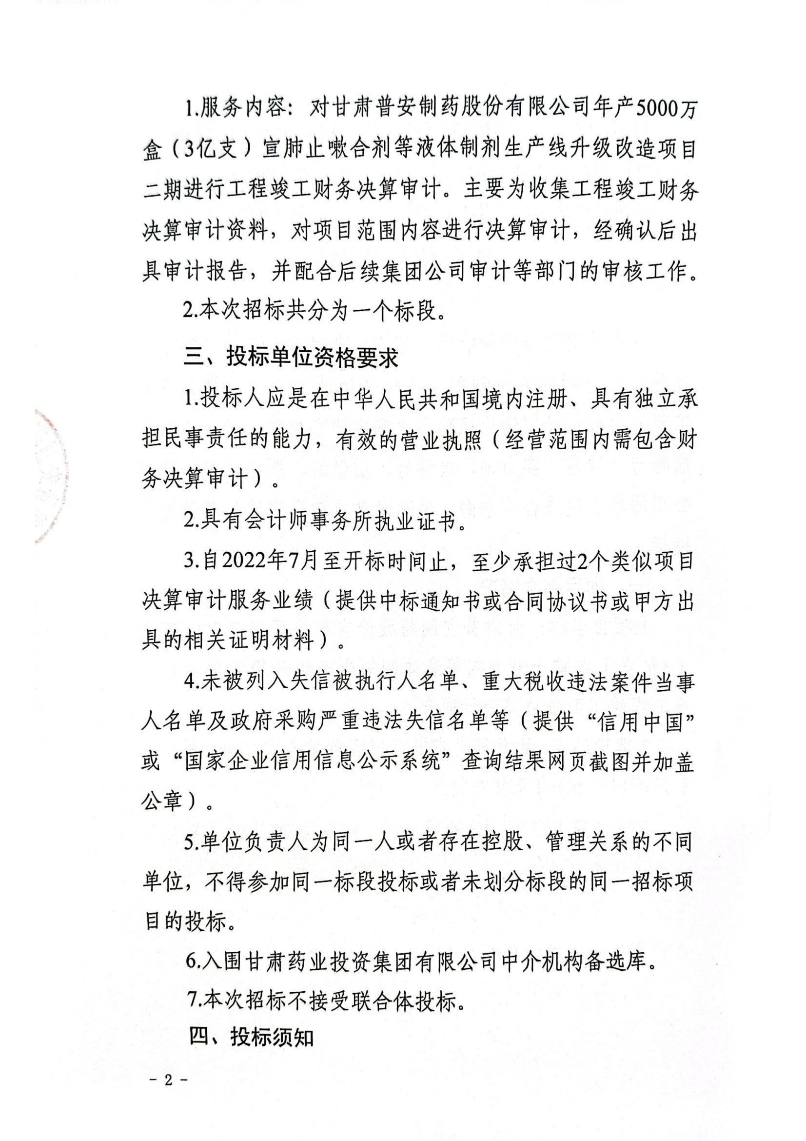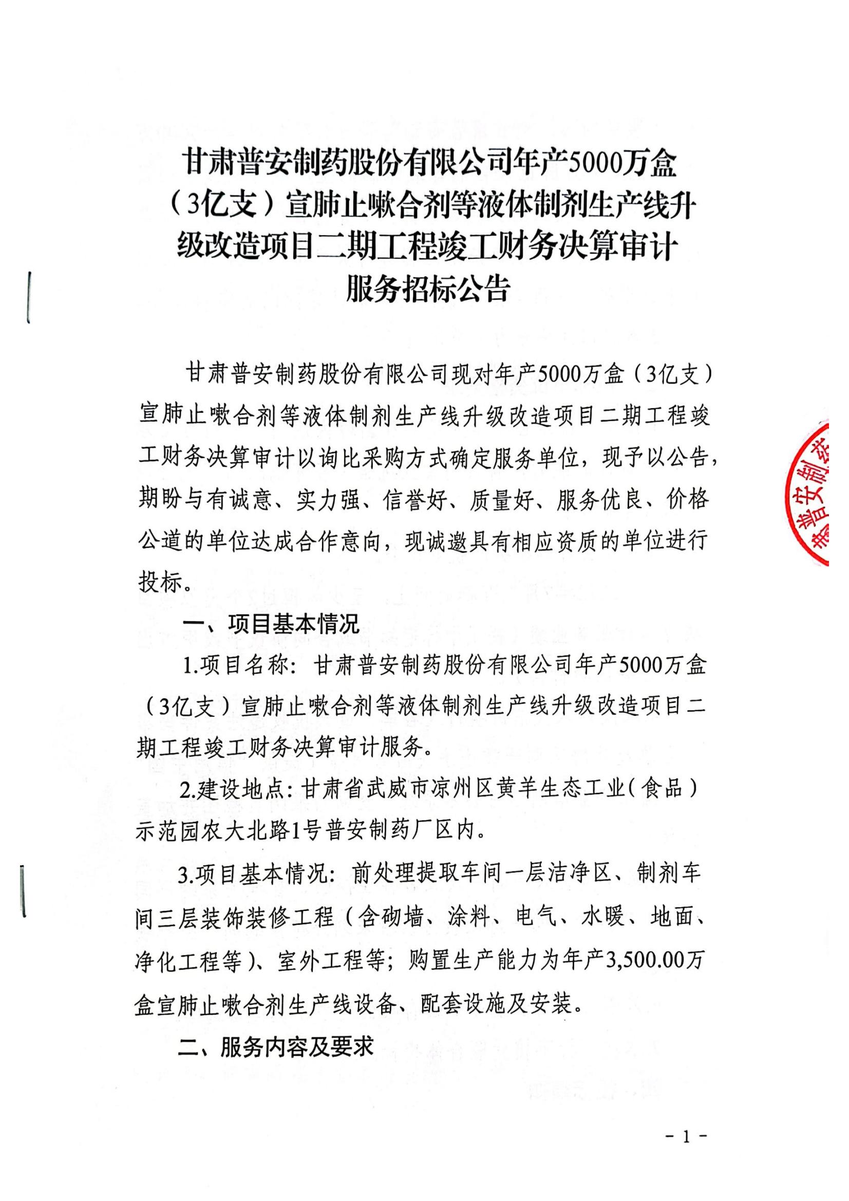 甘肅普安制藥股份有限公司年產(chǎn)5000萬盒宣肺止嗽合劑等液體制劑生產(chǎn)線升級改造項(xiàng)目二期竣工決算審計(jì)服務(wù)招標(biāo)公告