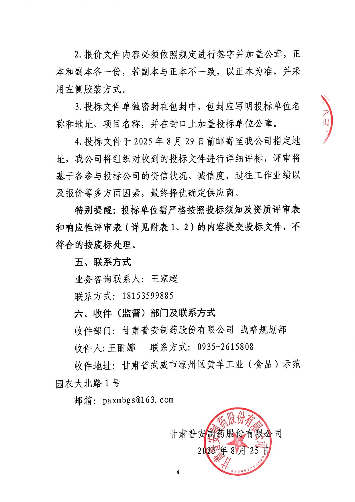 甘肅普安制藥股份有限公司 基礎設施改造項目監理服務詢價公告